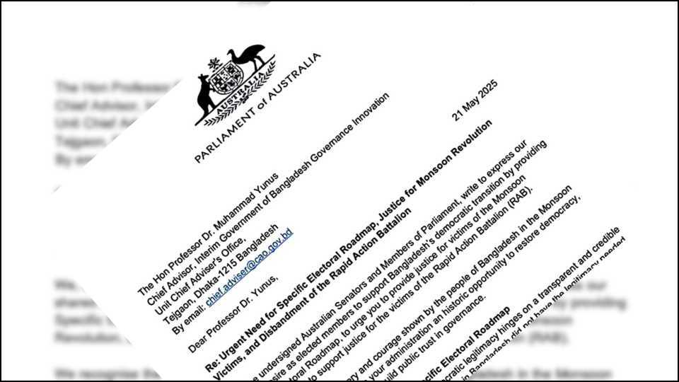 মুহাম্মদ ইউনূসকে উদ্দেশ করে লেখা ওই চিঠিতে বলা হয়েছে, “আমরা, স্বাক্ষরকারী অস্ট্রেলীয় সিনেটর ও এমপি হিসেবে, বাংলাদেশের গণতান্ত্রিক রূপান্তরের প্রতি আমাদের সমর্থন জানাচ্ছি। আমরা চাই আপনি অবিলম্বে একটি সুর্নির্দিষ্ট নির্বাচনী রোডম্যাপ ঘোষণা করবেন; জুলাইয়ের গণঅভ্যুত্থানে নিহত ও আহতদের জন্য বিচার নিশ্চিত করবেন এবং র্যাবের দ্বারা ক্ষতিগ্রস্তদের জন্য সুবিচার নিশ্চিত করবেন।”