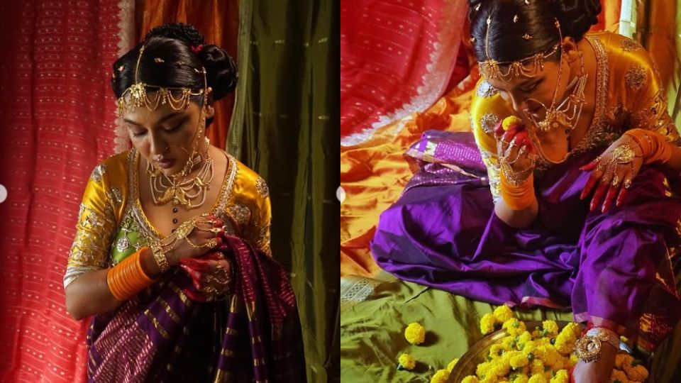 হলুদ জারদৌসি ব্লাউজ, সঙ্গে বেগুনি শাড়ি। আঁচল নামানো বুকের ওপর থেকে, উন্মুক্ত বক্ষের জয়ার সৌন্দর্য এড়িয়ে যাওয়ার উপায় নেই। আর হলদে চুড়ি, গয়না, মাথায় টায়রা ও নাকে নোলক অভিনেত্রীকে আরও আকর্ষণীয় করে তুলেছে।