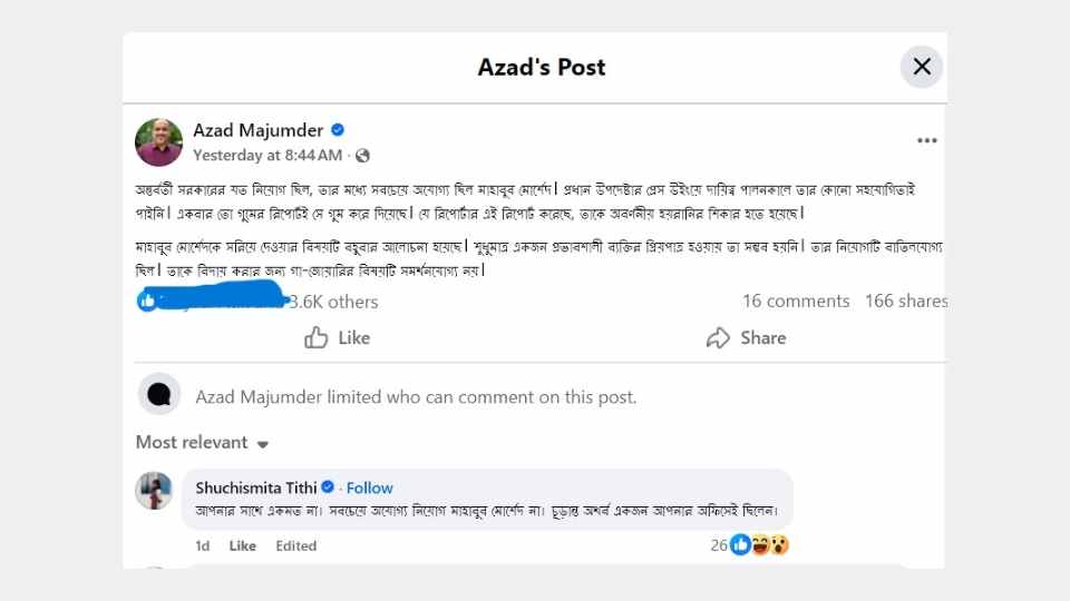 তাকে সরানোর এই চাপ নিয়ে আলোচনার মধ্যে আজাদ মজুমদার এক ফেসবুক পোস্টে লিখেছেন, মাহবুব মোর্শেদ এই পদে অযোগ্য ছিলেন। প্রধান উপদেষ্টা পদে ইউনূস থাকার সময় যে প্রেস উইং তৈরি করেছিলেন, তার একজন এই আজাদ মজুমদার, তার পদ ছিল প্রধান উপদেষ্টার উপ প্রেস সচিব।