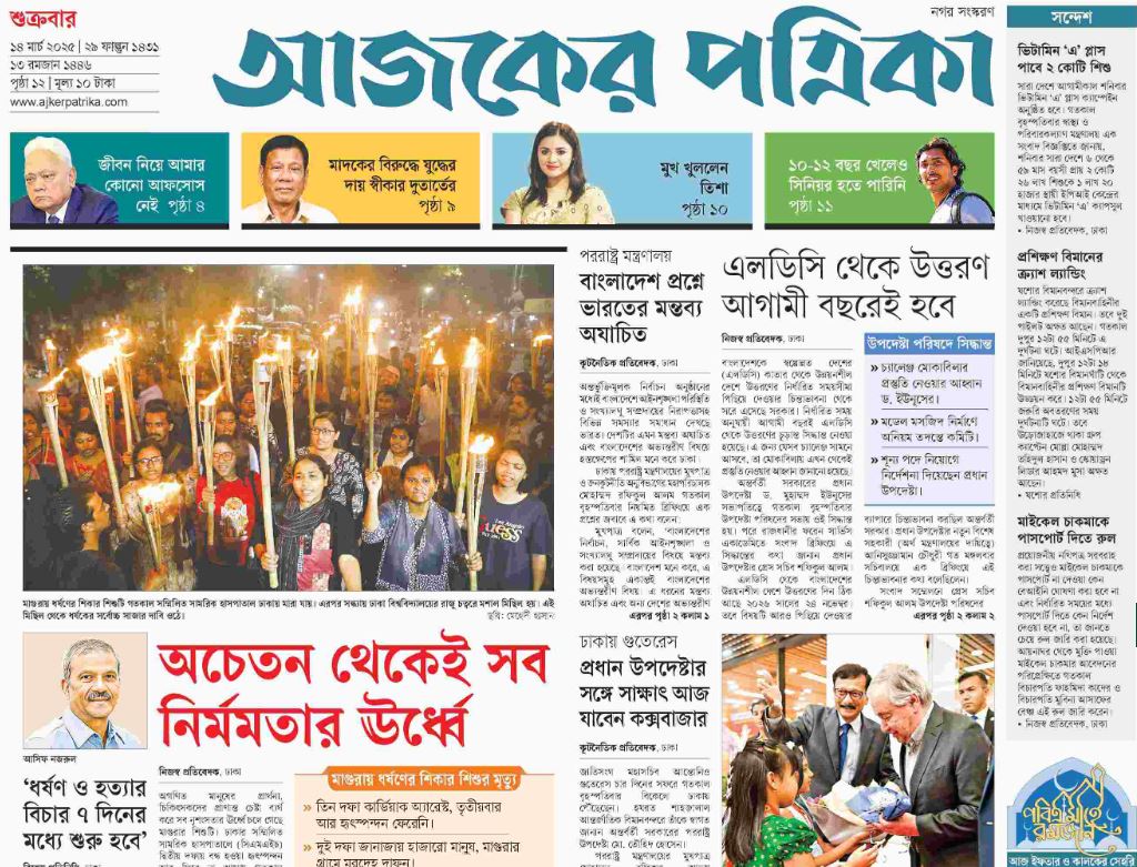 মাগুরায় ধর্ষণের শিকার ৮ বছরের শিশুটির মৃত্যুর খবর দিয়ে প্রধান প্রতিবেদন করেছে আজকের পত্রিকাও। ‘অচেতন থেকেই সব নির্মমতার ঊর্ধ্বে’ শিরোনামের প্রতিবেদনে বলা হয়, অগণিত মানুষের প্রার্থনা, চিকিৎসকদের প্রাণান্ত চেষ্টা ব্যর্থ করে সব নৃশংসতার ঊর্ধ্বে চলে গেছে মাগুরার শিশুটি। ঢাকার সম্মিলিত সামরিক হাসপাতালে (সিএমএইচ) দ্বিতীয় দফায় বন্ধ হওয়া হৃৎস্পন্দন আর ফিরে না আসায় গতকাল বৃহস্পতিবার বেলা ১টায় তাকে মৃত ঘোষণা করেন চিকিৎসকেরা। ধর্ষণ ও নির্মমতার শিকার মেয়েটি অচেতন অবস্থাতেই মাত্র আট বছর বয়সে পৃথিবী থেকে হারিয়ে গেল অনন্তে।