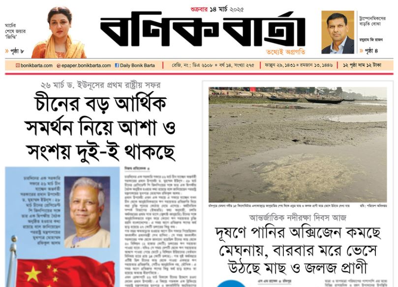 অন্তর্বর্তী সরকারের প্রধান উপদেষ্টা মুহাম্মদ ইউনূসের আসন্ন চীন সফরের খবরকে প্রধান প্রতিবেদন করেছে বণিক বার্তা। ‘চীনের বড় আর্থিক সমর্থন নিয়ে আশা ও সংশয় দুই-ই থাকছে’ শিরোনামের প্রতিবেদনে বলা হয়েছে, চারদিনের এক সরকারি সফরে ২৬ মার্চ চীন যাচ্ছেন অন্তর্বর্তী সরকারের প্রধান উপদেষ্টা ড. মুহাম্মদ ইউনূস। ২৮ মার্চ চীনের প্রেসিডেন্ট শি জিনপিংয়ের সঙ্গে তার এক দ্বিপক্ষীয় বৈঠক অনুষ্ঠিত হওয়ার কথা রয়েছে বলে জানিয়েছেন পররাষ্ট্র মন্ত্রণালয়ের মুখপাত্র মোহাম্মদ রফিকুল আলম।