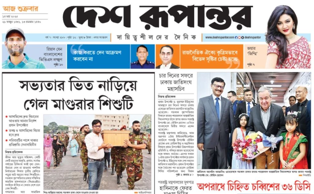 মাগুরায় ধর্ষণের শিকার ৮ বছরের শিশুটির মৃত্যুর খবর দিয়ে প্রধান প্রতিবেদন করেছে দেশ রূপান্তরও। ‘সভ্যতার ভিত নাড়িয়ে গেল মাগুরার শিশুটি’ শিরোনামের প্রতিবেদনে বলা হয়েছে, জীবন আর মৃত্যুর সন্ধিক্ষণ; কোটি কোটি মানুষের আকুতি, প্রার্থনা; সর্বোচ্চ পর্যায়ের চিকিৎসা সবই বৃথা গেল। বাঁচানো গেল না মাগুরায় পাশবিক নির্যাতনের শিকার তৃতীয় শ্রেণিতে পড়ুয়া আট বছরের কন্যা শিশুটিকে। গতকাল বৃহস্পতিবার ঢাকার সম্মিলিত সামরিক হাসপাতালে (সিএমএইচ) সবাইকে কাঁদিয়ে না ফেরার দেশে চলে গেল শিশুটি।