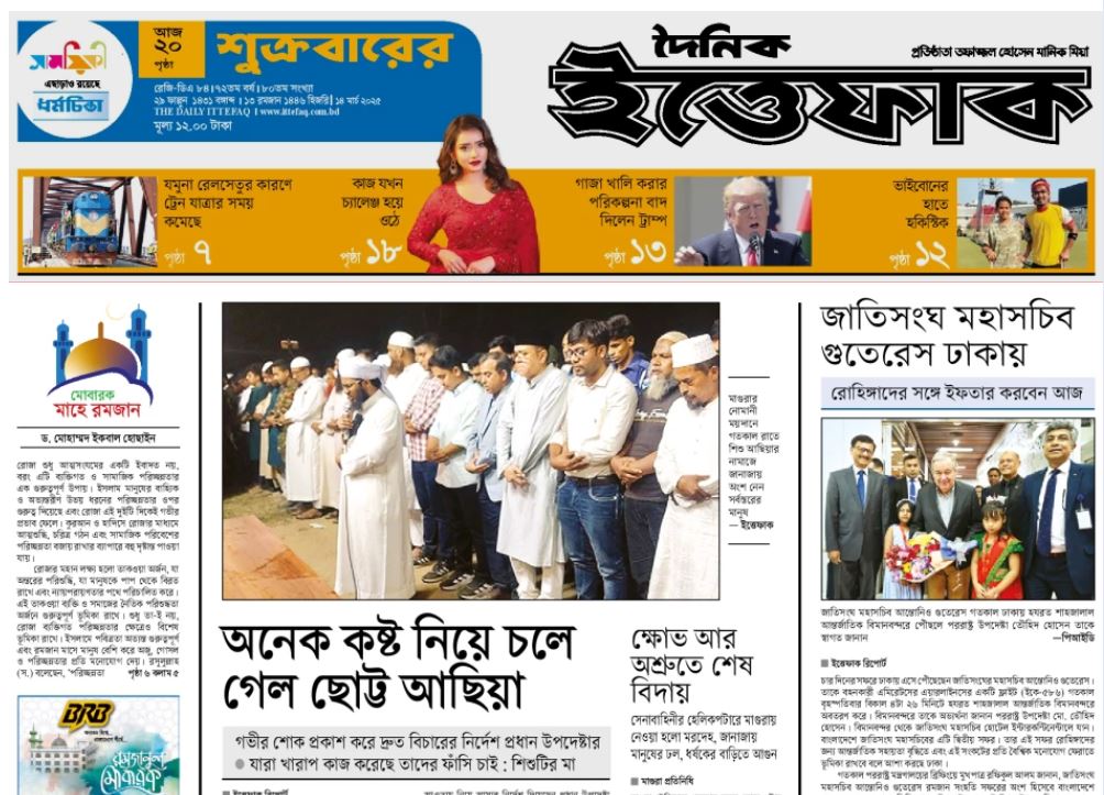 মাগুরায় ধর্ষণের শিকার ৮ বছরের শিশুটির মৃত্যুর খবর দিয়ে প্রধান প্রতিবেদন করেছে ইত্তেফাকও। ‘অনেক কষ্ট নিয়ে চলে গেল ছোট্ট আছিয়া’ শিরোনামের প্রতিবেদনে বলা হয়েছে, চিকিৎসকদের কোনো চেষ্টাই কাজে এলো না। শেষ পর্যন্ত বাঁচানো গেল না মাগুরায় ধর্ষণের শিকার আট বছরের শিশুটিকে। ছোট্ট শরীর আর হৃদয়ে অনেক ক্ষত নিয়ে নীরবে চলে গেল সে। গতকাল বৃহস্পতিবার দুপুর ১টায় ঢাকার সম্মিলিত সামরিক হাসপাতালে চিকিৎসাধীন অবস্থায় শিশুটির মৃত্যুর খবর নিশ্চিত করেছে আন্তঃবাহিনী জনসংযোগ পরিদপ্তর-আইএসপিআর। এই ঘটনায় গভীর শোক প্রকাশ করে আসামিদের দ্রুত বিচারের