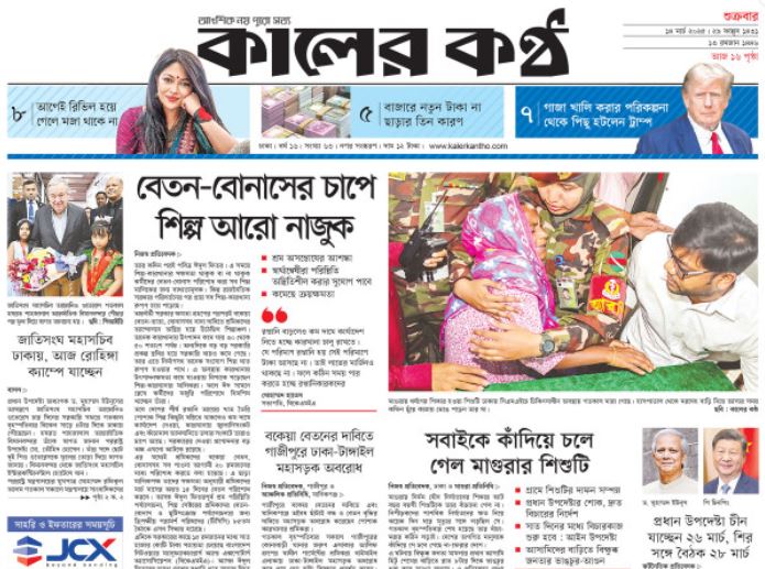 দেশে রাজনৈতিক পটপরিবর্তনের পর প্রায় সব শিল্প-কারখানা রুগ্ণ হয়ে পড়েছে– এমন খবর দিয়ে প্রধান প্রতিবেদন করেছে কালের কণ্ঠ। ‘বেতন-বোনাসের চাপে শিল্প আরো নাজুক’ শিরোনামের প্রতিবেদনে বলা হয়েছে, আর কদিন পরই পবিত্র ঈদুল ফিতর। এ সময়ে শিল্প-কারখানার সক্ষমতা থাকুক বা না থাকুক কর্মীদের বেতন-বোনাস পরিশোধ করা সব শিল্প মালিকের জন্য বাধ্যতামূলক। কিন্তু রাজনৈতিক সরকার পরিবর্তনের পর প্রায় সব শিল্প-কারখানা রুগ্ণ হয়ে পড়েছে।
