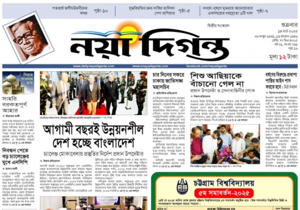 স্বল্পোন্নত দেশের তালিকা থেকে উন্নয়নশীল দেশের কাতারে বাংলাদেশের উত্তোরণ আগামী বছরই হচ্ছে– সরকারের জানানো এমন খবর দিয়েই প্রধান প্রতিবেদন করেছে নয়াদিগন্ত। ‘আগামী বছরই উন্নয়নশীল দেশ হচ্ছে বাংলাদেশ’ শিরোনামের প্রতিবেদনে বলা হয়েছে, আগামী বছরই (২০২৬) স্বল্পোন্নত দেশ (এলডিসি) থেকে বাংলাদেশকে উন্নয়নশীল দেশে উত্তরণে সম্ভাব্য চ্যালেঞ্জ মোকাবেলায় সংশ্লিষ্ট সবাইকে প্রস্তুত থাকার নির্দেশ দিয়েছেন প্রধান উপদেষ্টা অধ্যাপক ড. মুহাম্মদ ইউনূস। গতকাল বৃহস্পতিবার উপদেষ্টা পরিষদের বৈঠকে তিনি এই নির্দেশ দেন। ২০২৬ সালের নভেম্বরে বাংলাদেশ স্বল্পোন্নত দেশ (এলডিসি) থেকে উন্নয়নশীল দেশে উন্নীত হওয়ার কথা রয়েছে।