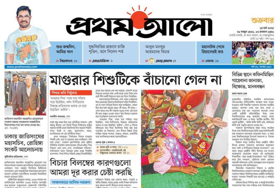 মাগুরায় ধর্ষণের শিকার ৮ বছরের শিশুটির মৃত্যুর খবর দিয়ে প্রধান প্রতিবেদন করেছে প্রথম আলোও। ‘মাগুরার শিশুটিকে বাঁচানো গেল না’ শিরোনামের প্রতিবেদনে বলা হয়েছে, বড়ই অল্প সময় ছিল তার পৃথিবীতে বসবাস। সেই স্বল্পায়ু জীবনে এক বিরাট বিপুল নির্মমতার সুতীব্র যন্ত্রণায় পৃথিবী থেকে চিরবিদায় নিল অবোধ শিশুটি। অথচ কতই না প্রেম, ভালোবাসা, মহত্ত্ব, মানবিকতার গর্ব এই পৃথিবীকে নিয়ে!