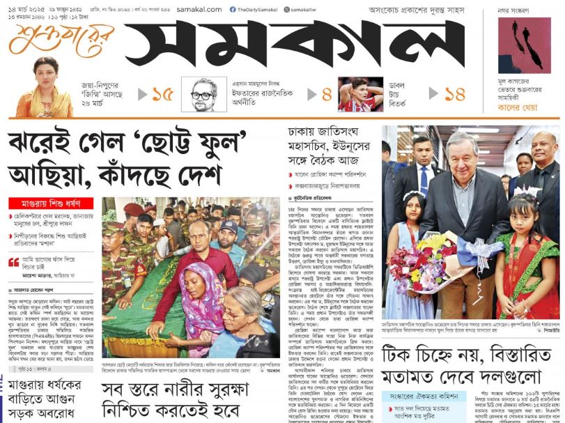 মাগুরায় ধর্ষণের শিকার ৮ বছরের শিশুটির মৃত্যুর খবর দিয়ে প্রধান প্রতিবেদন করেছে সমকাল। ‘ঝরেই গেল ‘ছোট্ট ফুল’ আছিয়া, কাঁদছে দেশ’ শিরোনামের প্রতিবেদনে বলা হয়েছে, শিশু আছিয়া খাতুন সেই কফিনে ‘ঘুমে’। মমতামাখা হাতে সেই কফিন স্পর্শ করছিলেন মা আয়েশা আক্তার। ততক্ষণে জানা হয়ে গেছে, আর কখনও ঘুম ভাঙবে না বুকের নিধি আছিয়ার। গতকাল বৃহস্পতিবার ঢাকার সম্মিলিত সামরিক হাসপাতালের (সিএমএইচ) হিমঘরের সামনে তখন পিনপতন নিঃশব্দ। মধ্যদুপুরে আছিয়া নামে ‘ছোট্ট ফুল’ অকালে ঝরে যাওয়ায় ফাল্গুনের শেষ বিকেলটায় সবার মনে যন্ত্রণার পীড়া। আছিয়ার কফিন যখন বের করে আনা হয়, তখন হঠাৎ ভেঙে যায় নীরবতা। মায়ের হৃদয়ভায় আর্তনাদে উপস্থিত সবার চোখের আঙিনায় বোনাজল। ‘আছিয়া আছিয়া’ বিলাপ যেন মামছিল না আয়েশার। মাগুরায় বর্ষণের শিরায় আছিয়া দেশ- বিদেশের কোটি মানুষের জন্য নাড়িয়ে গতকাল দুপুরে চলে গেল অনন্তলোকে।