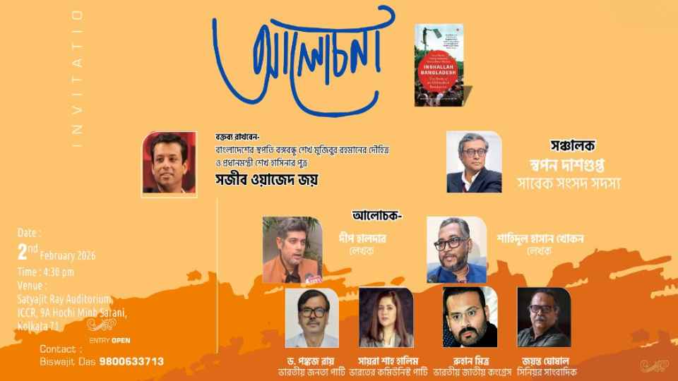 সাবেক সংসদ সদস্য স্বপন দাসগুপ্তের সঞ্চালনায় সোমবার যে অনুষ্ঠানে জয়ের বক্তব্য দেওয়া কথা রয়েছে সেখানে ভারতের একাধিক রাজনৈতিক নেতাও অংশ নেবেন বলে আয়োজকরা জানিয়েছেন।