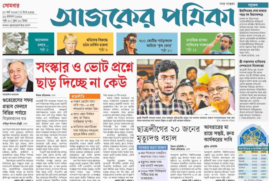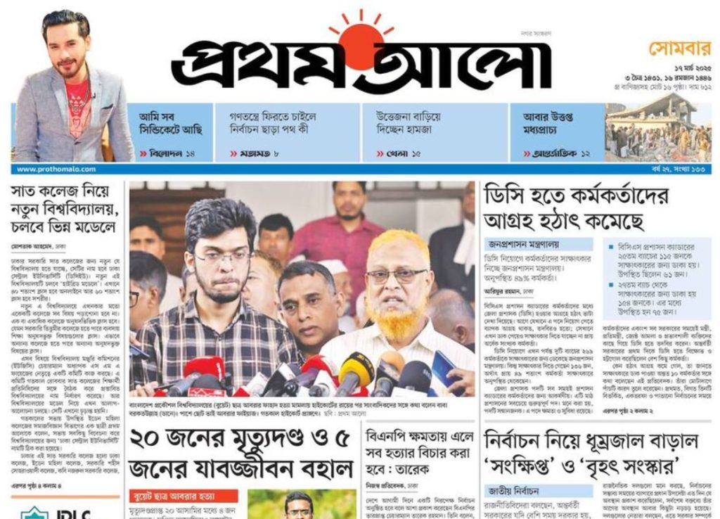 বাংলাদেশ প্রকৌশল বিশ্ববিদ্যালয়ের (বুয়েট) শিক্ষার্থী আবরার হত্যাকাণ্ডে নিম্ন আদালতের দেওয়ার রায় হাইকোর্টে বহাল থাকার খবর দিয়ে প্রধান প্রতিবেদন করেছে প্রথম আলো। ‘২০ জনের মৃত্যুদণ্ড ও ৫ জনের যাবজ্জীবন বহাল’ শিরোনামের প্রতিবেদনে বলা হয়েছে, অন্তর্বর্তী সরকারের চলমান সংস্কারপ্রক্রিয়া সম্পর্কে অবহিত হলেন জাতিসংঘের মহাসচিব আন্তোনিও গুতেরেস। বাংলাদেশের গণতান্ত্রিক উত্তরণ প্রত্যাশা করে সংস্কারে সহায়তার কথাও জানালেন তিনি। তবে কাজটি দেশের রাজনৈতিক দল ও সরকারকেই করতে হবে বলে মনে করেন তিনি। এ জন্য ঐকমত্য প্রতিষ্ঠার ওপর জোর দিয়েছেন জাতিসংঘ মহাসচিব।