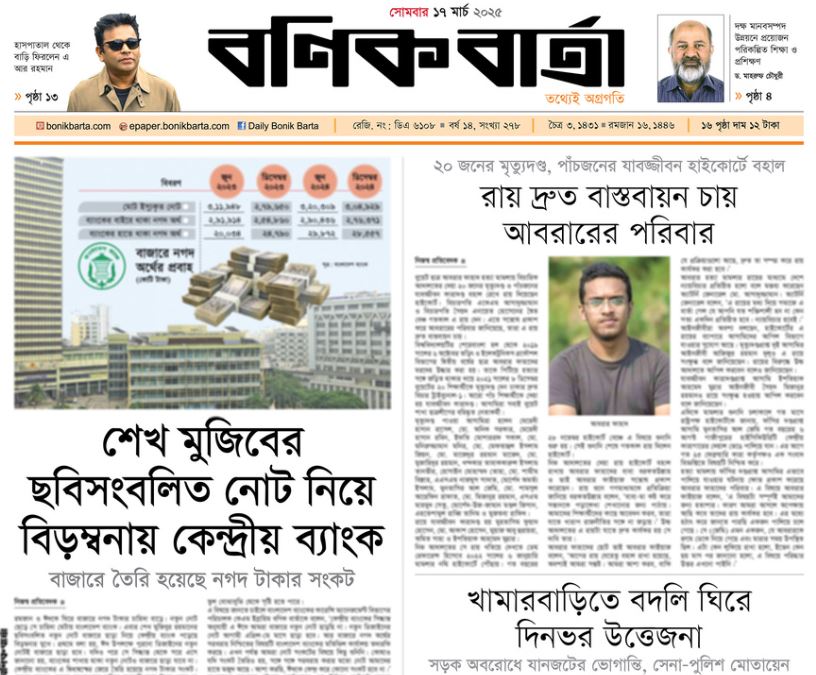 বঙ্গবন্ধু শেখ মুজিবুর রহমানের ছবিসংবলিত নোট নিয়ে বাংলাদেশ ব্যাংকের বিড়ম্বনায় পড়ার খবর দিয়ে প্রধান প্রতিবেদন করেছে বণিক বার্তা। ‘শেখ মুজিবের ছবিসংবলিত নোট নিয়ে বিড়ম্বনায় কেন্দ্রীয় ব্যাংক’ শিরোনামের প্রতিবেদনে বলা হয়েছে, রমজান ও ঈদকে ঘিরে বাজারে নগদ টাকার চাহিদা বাড়ে। নতুন নোট ছেড়ে সে চাহিদা মেটায় বাংলাদেশ ব্যাংক। এবার শেখ মুজিবুর রহমানের ছবিসংবলিত নতুন নোট বাজারে ছাড়া নিয়ে কেন্দ্রীয় ব্যাংক পড়েছে বিড়ম্বনার মুখে। প্রথমে বলা হয়, ঈদ উপলক্ষে পুরনো ডিজাইনের নতুন নোটই বাজারে ছাড়া হবে। যদিও পরে সে সিদ্ধান্ত থেকে সরে এসে জানানো হয়, ব্যাংকের শাখায় থাকা নতুন নোটও বাজারে ছাড়া যাবে না। কেন্দ্রীয় ব্যাংকের এ দ্বিধাদ্বন্দ্বের জেরে তৈরি হয়েছে নগদ টাকার সংকট। দেশের অনেক জেলায় ব্যাংকগুলো চাহিদা অনুযায়ী নগদ টাকা পাচ্ছে না বলে জানা গেছে।