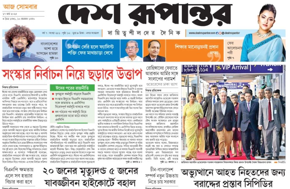 অন্তর্বর্তী সরকারের সংস্কারের উদ্যোগ ঘিরে দেশের রাজনীতিতে উত্তাপ বাড়ছে– এমন খবর দিয়ে প্রধান প্রতিবেদন করেছে দেশ রূপান্তরও। ‘সংস্কার নির্বাচন নিয়ে ছড়াবে উত্তাপ’ শিরোনামের প্রতিবেদনে বলা হয়েছে, জাতিসংঘের মহাসচিব আন্তোনিও গুতেরেস বলেছেন, বাংলাদেশ গুরুত্বপূর্ণ সংস্কার ও গণতান্ত্রিক অভিযাত্রার গুরুত্বপূর্ণ পর্বে রয়েছে। বাংলাদেশের এই সন্ধিক্ষণে শান্তি, সংলাপ ও ঐকমত্যে সহায়তার জন্য জাতিসংঘ তৈরি আছে।