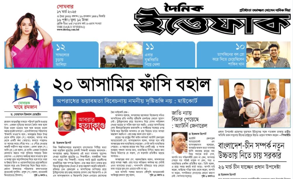 বাংলাদেশ প্রকৌশল বিশ্ববিদ্যালয়ের (বুয়েট) শিক্ষার্থী আবরার হত্যাকাণ্ডে নিম্ন আদালতের দেওয়ার রায় হাইকোর্টে বহাল থাকার খবর দিয়ে প্রধান প্রতিবেদন করেছে ইত্তেফাকও। ’২০ আসামির ফাঁসি বহাল’ শিরোনামের প্রতিবেদনে বলা হয়েছে, নিজ বিশ্ববিদ্যালয়ের ছাত্রাবাসে নৃশংসভাবে পিটিয়ে হত্যা করা হয়েছিল বুয়েটের মেধাবী শিক্ষার্থী আবরার ফাহাদকে। অপরাধের গুরুত্ব বিবেচনায় এই হত্যা মামলায় মৃত্যুদণ্ড দেওয়া হয়েছিল বুয়েটের ২০ শিক্ষার্থীকে। যাবজ্জীবন সাজা পান আরো পাঁচ শিক্ষার্থী। যাদের সবাই বুয়েট ছাত্রলীগের রাজনীতির সঙ্গে সম্পৃক্ত ছিলেন। চার বছর আগে ঢাকার দ্রুত বিচার ট্রাইব্যুনালের দেওয়া ঐ রায়ে হস্তক্ষেপ করেনি হাইকোর্ট। রবিবার ডেথ রেফারেন্স ও আসামিদের আপিলের রায়ে ট্রাইব্যুনালের রায় হুবহু বহালের ঘোষণা দেয় বিচারপতি এ কে এম আসাদুজ্জামান ও বিচারপতি সৈয়দ এনায়েত হোসেনের দ্বৈত হাইকোর্ট বেঞ্চ।