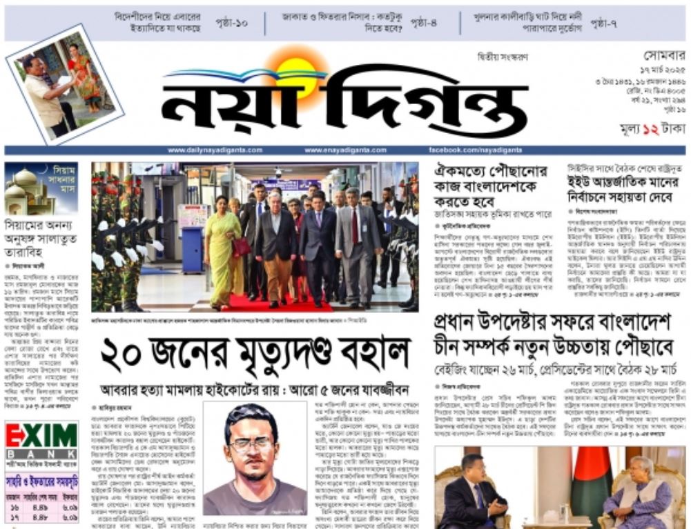বাংলাদেশ প্রকৌশল বিশ্ববিদ্যালয়ের (বুয়েট) শিক্ষার্থী আবরার হত্যাকাণ্ডে নিম্ন আদালতের দেওয়ার রায় হাইকোর্টে বহাল থাকার খবর দিয়ে প্রধান প্রতিবেদন করেছে নয়া দিগন্তও। ‘২০ জনের মৃত্যুদণ্ড বহাল’শিরোনামের প্রতিবেদনে বলা হয়েছে, বাংলাদেশ প্রকৌশল বিশ্ববিদ্যালয়ের (বুয়েট) ছাত্র আবরার ফাহাদকে নৃশংসভাবে পিটিয়ে হত্যা মামলায় ২০ জনের মৃত্যুদণ্ড ও পাঁচজনের যাবজ্জীবন কারাদণ্ড বহাল রেখেছেন হাইকোর্ট। গতকাল বিচারপতি এ কে এম আসাদুজ্জামান ও বিচারপতি সৈয়দ এনায়েত হোসেনের হাইকোর্ট বেঞ্চ আসামিদের ডেথ রেফারেন্স অনুমোদন করে এ রায় ঘোষণা করেন।