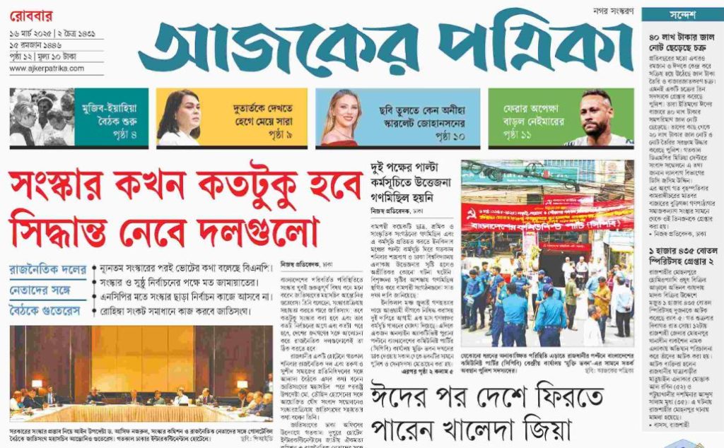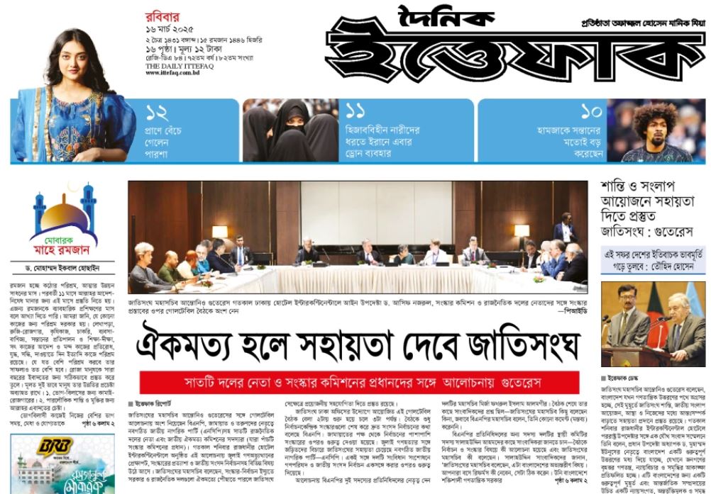 জাতিসংঘ মহাসচিব আন্তোনিও গুতেরেসের বাংলাদেশ সফর এবং রাজনৈতিক দল ও সরকারের প্রতিনিধিদের সঙ্গে তার বৈঠকের খবর দিয়ে প্রধান প্রতিবেদন করেছে ইত্তেফাকও। ‘ঐকমত্য হলে সহায়তা দেবে জাতিসংঘ’ শিরোনামের প্রতিবেদনে বলা হয়েছে, জাতিসংঘের মহাসচিব আন্তোনিও গুতেরেসের সঙ্গে গোলটেবিল আলোচনায় অংশ নিয়েছেন বিএনপি, জামায়াত ও তরুণদের নেতৃত্বে নবগঠিত জাতীয় নাগরিক পার্টি (এনসিপি) সহ সাতটি রাজনৈতিক দলের নেতা এবং জাতীয় ঐকমত্য কমিশনের সদস্যরা (যারা পাঁচটি সংস্কার কমিশনের প্রধান)। গতকাল শনিবার রাজধানীর হোটেল ইন্টারকন্টিনেন্টালে অনুষ্ঠিত এই আলোচনায় জুলাই গণঅভ্যুত্থানের প্রেক্ষাপট, সংস্কারের প্রত্যাশা ও জাতীয় সংসদ নির্বাচনসহ বিভিন্ন বিষয় উঠে আসে। জাতিসংঘের মহাসচিব বলেছেন, সংস্কার-নির্বাচন ইস্যুতে সরকার ও রাজনৈতিক দলগুলো ঐকমত্যে পৌঁছাতে পারলে জাতিসংঘ সেক্ষেত্রে প্রয়োজনীয় সহযোগিতা দিতে প্রস্তুত রয়েছে।