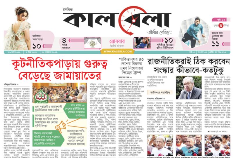 আন্তর্জাতিক পরিমণ্ডলে জামায়াতে ইসলামীর গ্রহণযোগ্যতা ও গুরুত্ব বেড়েছে– এমন খবর দিয়ে প্রধান প্রতিবেদন করেছে কালবেলা। ‘কূটনীতিকপাড়ায় গুরুত্ব বেড়েছে জামায়াতের’ শিরোনামের প্রতিবেদনে বলা হয়েছে, বিশ্বদরবারে বাংলাদেশ জামায়াতে ইসলামীর গ্রহণযোগ্যতা ও গুরুত্ব বেড়েছে। সংগঠনটির নেতারাও প্রভাবশালী এবং উন্নত রাষ্ট্রগুলোর সঙ্গে কূটনৈতিক সম্পর্কোন্নয়নে মনোযোগী হয়েছেন। গত সাত মাসে তারা অন্তত ১৫টি দেশের রাষ্ট্রদূত, হাইকমিশনার ও কূটনীতিকদের সঙ্গে নিবিড় বৈঠক করেছেন। চীনসহ প্রভাবশালী পাঁচটি দেশ সফর করেছেন জামায়াতের আমির ও সেক্রেটারি জেনারেল। এর মধ্য দিয়ে বিশ্বদরবারে নিজেদের নতুনভাবে তুলে ধরছে জামায়াত। তারা প্রমাণ করতে চাইছে ক্ষমতাচ্যুত আওয়ামী লীগ সরকারের সময় জামায়াত প্রসঙ্গে যেসব বার্তা বিশ্বদরবারে দেওয়া হয়েছে, সেগুলো ‘সম্পূর্ণ ভুল, মিথ্যা ও ভিত্তিহীন।’ সংগঠনের নেতারা নিজেদের পজিটিভ ইমেজ বিশ্বদরবারে তুলে ধরার লক্ষ্যে নিরলসভাবে কাজ করে যাচ্ছেন। এর মাধ্যমে জামায়াত আন্তর্জাতিকভাবে নিজেদের পক্ষে সমর্থন আদায়ের চেষ্টা করছে।