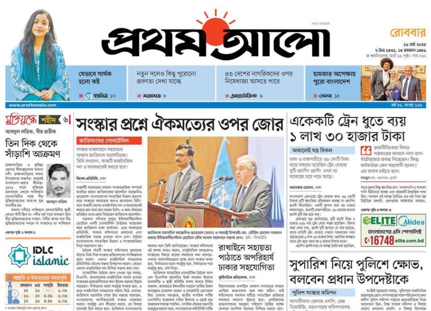 জাতিসংঘ মহাসচিব আন্তোনিও গুতেরেসের বাংলাদেশ সফর এবং রাজনৈতিক দল ও সরকারের প্রতিনিধিদের সঙ্গে তার বৈঠকের খবর দিয়ে প্রধান প্রতিবেদন করেছে প্রথম আলো। ‘সংস্কার প্রশ্নে ঐকমত্যের ওপর জোর’ শিরোনামের প্রতিবেদনে বলা হয়েছে, অন্তর্বর্তী সরকারের চলমান সংস্কারপ্রক্রিয়া সম্পর্কে অবহিত হলেন জাতিসংঘের মহাসচিব আন্তোনিও গুতেরেস। বাংলাদেশের গণতান্ত্রিক উত্তরণ প্রত্যাশা করে সংস্কারে সহায়তার কথাও জানালেন তিনি। তবে কাজটি দেশের রাজনৈতিক দল ও সরকারকেই করতে হবে বলে মনে করেন তিনি। এ জন্য ঐকমত্য প্রতিষ্ঠার ওপর জোর দিয়েছেন জাতিসংঘ মহাসচিব।