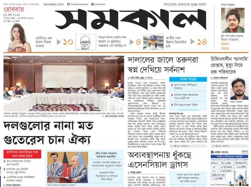 জাতিসংঘ মহাসচিব আন্তোনিও গুতেরেসের বাংলাদেশ সফর এবং রাজনৈতিক দল ও সরকারের প্রতিনিধিদের সঙ্গে তার বৈঠকের খবর দিয়ে প্রধান প্রতিবেদন করেছে সমকালও। ‘দলগুলোর নানা মত, গুতেরেস চান ঐক্য’ শিরোনামের প্রতিবেদনে বলা হয়েছে, জাতিসংঘ মহাসচিব আন্তোনিও গুতেরেসের সঙ্গে বৈঠকে সংস্কার এবং নির্বাচন নিয়ে দলীয় অবস্থান তুলে ধরেছে রাজনৈতিক দলগুলো। সংস্কার দ্রুত সম্পন্ন করে নির্বাচন আয়োজনের পক্ষে মত দিয়েছে বিএনপি। জামায়াতে ইসলামী জানিয়েছে, টেকসই গণতন্ত্র এবং সুষ্ঠু নির্বাচন চায়। এনসিপির চাওয়া গণপরিষদের সংবিধান সংস্কার। সংস্কার কমিশনগুলো বৈঠকে সংস্কারের সারসংক্ষেপ তুলে ধরে। জাতিসংঘ মহাসচিব বলেন, ‘সংস্কার প্রয়োজনীয়। জাতিসংঘ এতে পাশে থাকবে। সংস্কার কীভাবে, কতটুকু হবে, তা জনগণ ও রাজনৈতিক দলগুলোকে একমত হয়ে করতে হবে।’ পর্তুগালের উদাহরণ দিয়ে তিনি আশাবাদ জানিয়েছেন, জনগণ এবং রাজনৈতিক দলগুলো মিলে এই পথ পাড়ি দিতে পারবে।