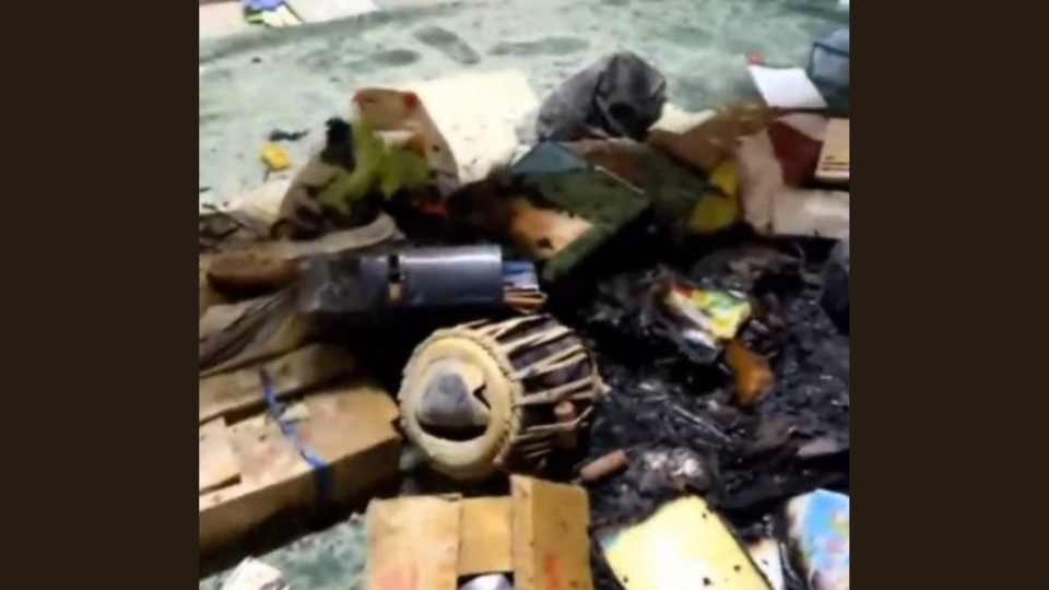 প্রত্যক্ষদর্শীরা জানিয়েছেন, বিভিন্ন তলায় থাকা বাদ্যযন্ত্র ও শিল্পকর্ম গুড়িয়ে দেওয়া হয়েছে। পাশাপাশি বিভিন্ন কক্ষে থাকা কাগজপত্র ছিন্নভিন্ন হয়ে পড়ে থাকতে দেখা গেছে।
