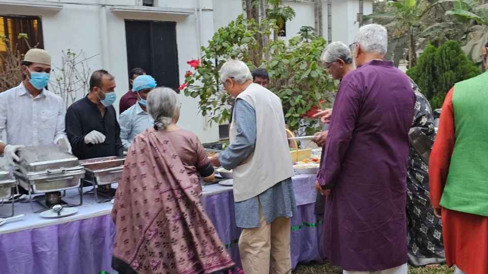 মন্ত্রিপাড়ার এই বাড়িটির সবুজ চত্বরে আয়োজিত হয়েছিল এই অনুষ্ঠান। সেখানে এক পাশে ছিল বসার জন্য চেয়ার-টেবিলের ব্যবস্থা। অন্য পাশে ছিল খাবারের আয়োজন।